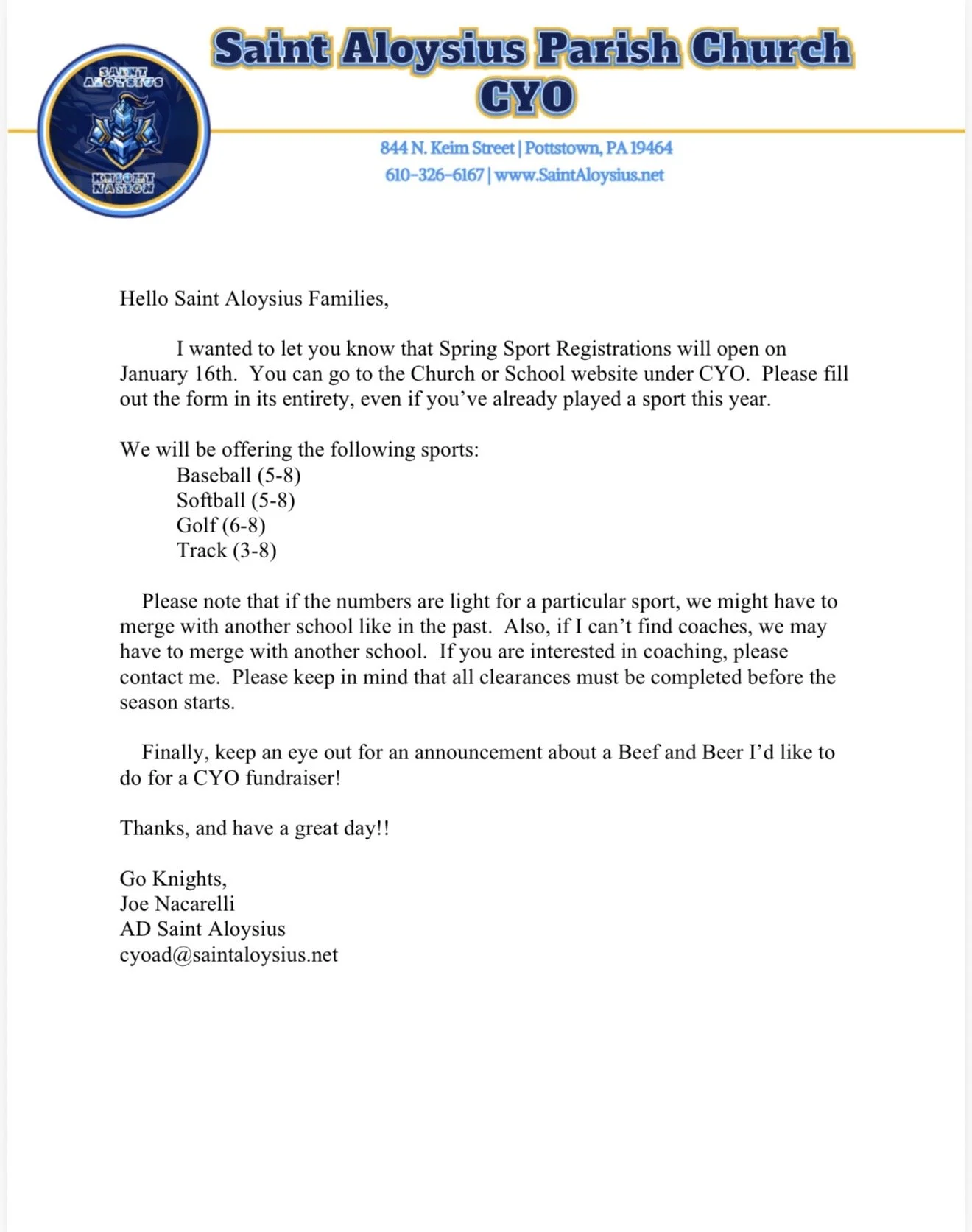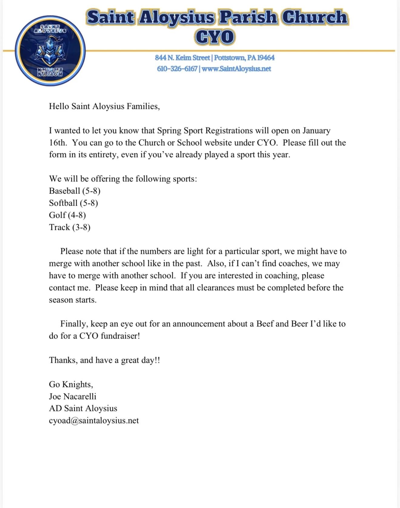 Registration for the 2025–2026 school year is officially closed for Saint Aloysius CYO Fall Sports!